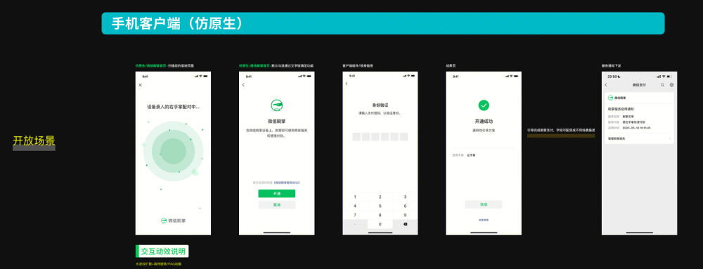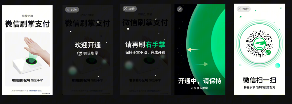 5、在手机端上进行授权开通此项功能,扫描小程序后,点击微信刷掌功能进行开通,开通时需要输入微信支付密码做身份核验;操作步骤如下图所示: