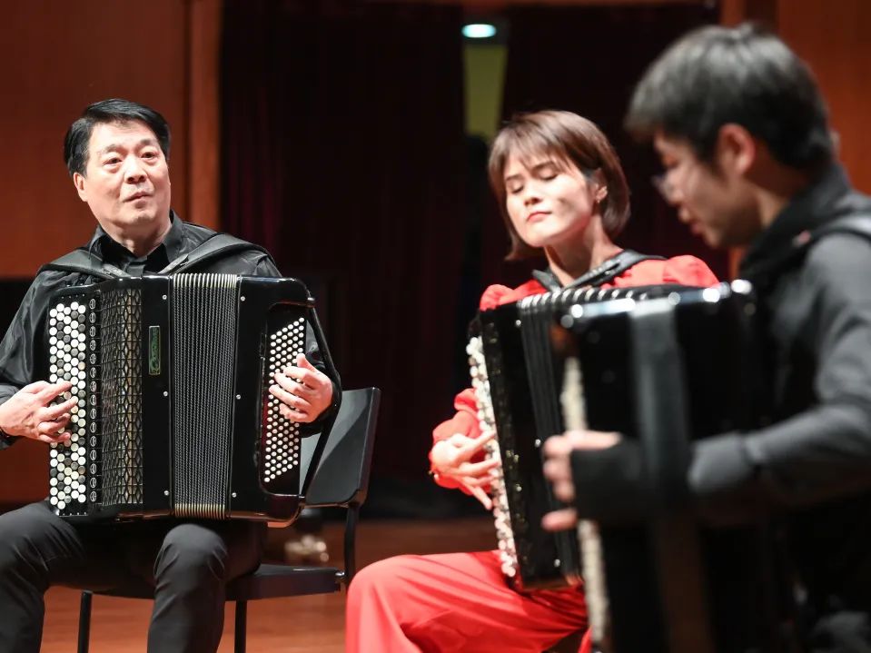 民革上音支部的党员们也献上了精彩的演绎:王海灵指挥的女声合唱台湾民谣《想欲弹同调》和云南民歌《醉在云故乡》优美空灵,曾梦携学生演绎气势恢宏的电子管风琴二重奏《在希望的田野上》,上音手风琴专业学科带头人徐达维与学生共同带来巴扬三重奏《拉斯布哈》,杨蚕与来自台湾地区的“小星辰钢琴三重奏”带来台湾民谣《月夜愁》《望春风》。本场音乐会有多首曲目由著名作曲家叶国辉改编,压轴曲目《引子与茉莉花》是世界首演,系他为本次音乐会专门创作,由上海音乐学院室内乐团与台湾D.S.室内乐坊联袂演出,宛转悠扬又大气磅礴的中国风,将现场热烈气氛推至了最高潮。