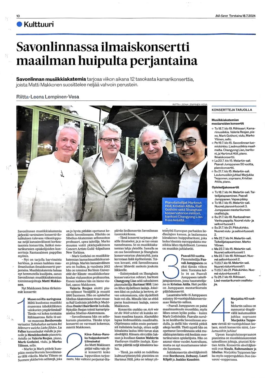艺术处副处长朱丹丹谈到,作为首次在该舞台亮相的高校团队,上音通过多年的学术深耕和国际合作,以艺术歌曲、室内乐、大师班等形式呈现了丰富多样的中国音乐文化,赢得芬兰观众和国际艺术界的一致好评。未来,上音将继续拓展与萨翁林纳歌剧节的合作范围,通过音乐搭建文化交流桥梁,持续扩大上音影响力。