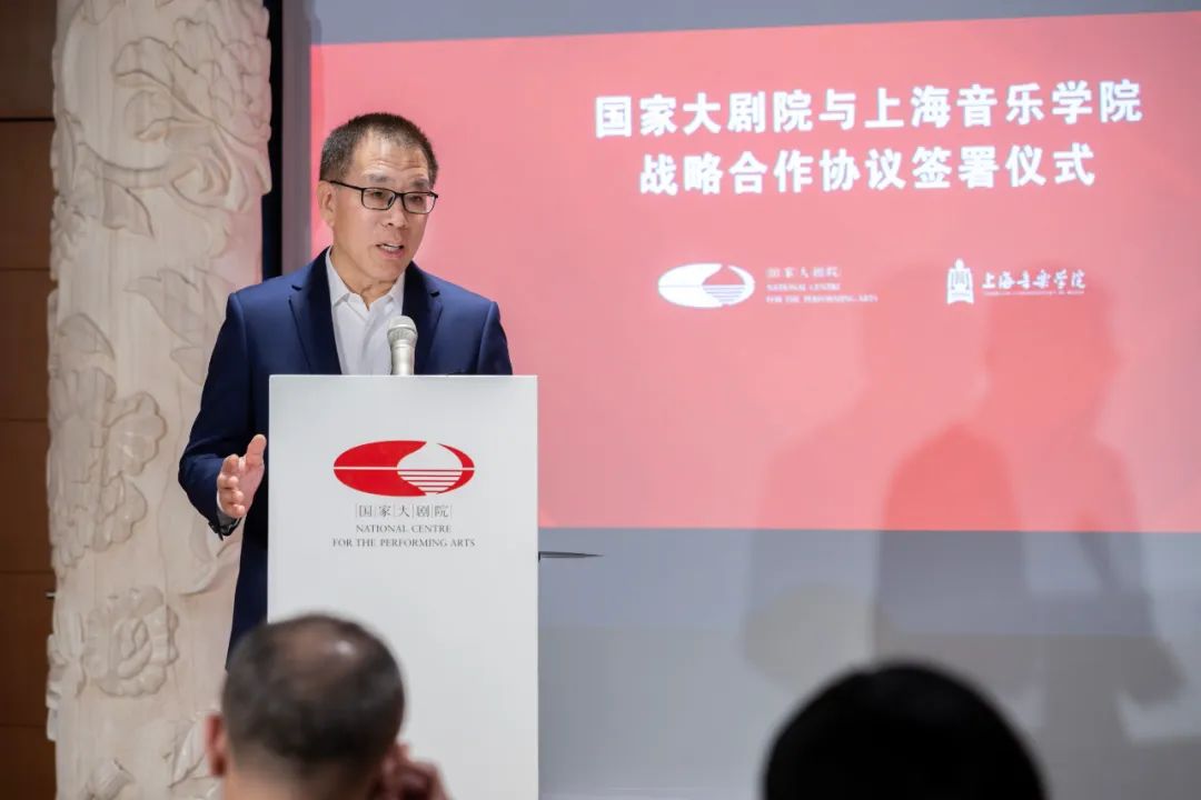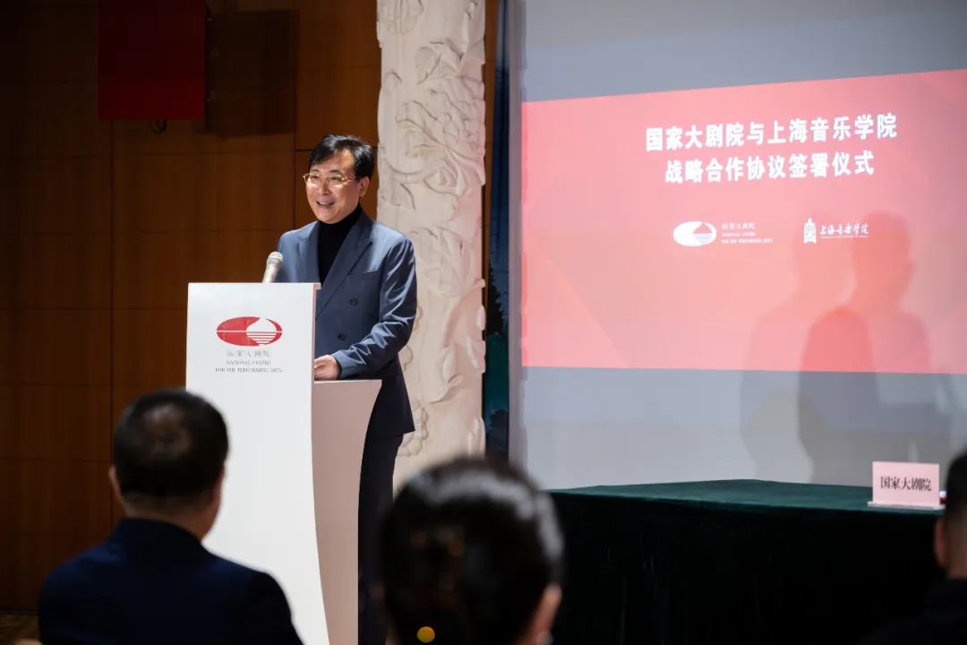 廖昌永代表上海音乐学院致辞。他指出,此次签约是双方学习贯彻落实习近平文化思想、共同推动中国音乐文化繁荣发展的重要举措。国家大剧院是中国最高的表演艺术殿堂和世界一流的艺术平台,以开放包容、胸怀天下的大格局,为全球观众呈现精彩的艺术盛宴,推动中外文明交流互鉴。他简要介绍了上海音乐学院的办学历史、人才培养和加快建成中国特色、世界一流高等音乐学府的情况。他表示,上海音乐学院与国家大剧院合作由来已久,十几年来,上海持续参加国家大剧院“春华秋实”艺术展演,同时,上音优秀师生和校友几乎每年都会登上国家大剧院舞台。他强调,此次签约,双方将共同构建艺术创作、展演平台,坚持以人民为中心创作理念,打造中国艺术经典;共同构建艺术普及教育平台,以美育人、以文化人;共同构建音乐艺术研究平台,促进中华优秀传统文化创造性转化、创新性发展;共同构建高校艺术实践、志愿服务平台,致力于公益演出与艺术普及;共同构建国际文化艺术交流平台,推动中化文化“走出去”。