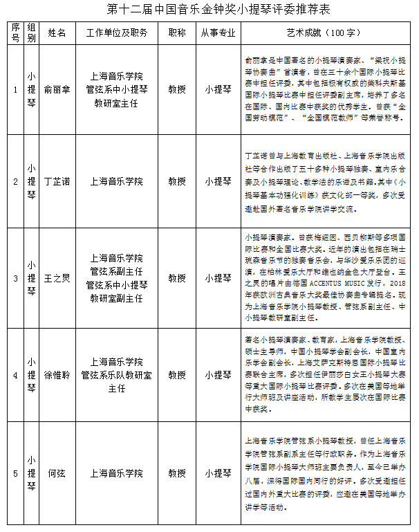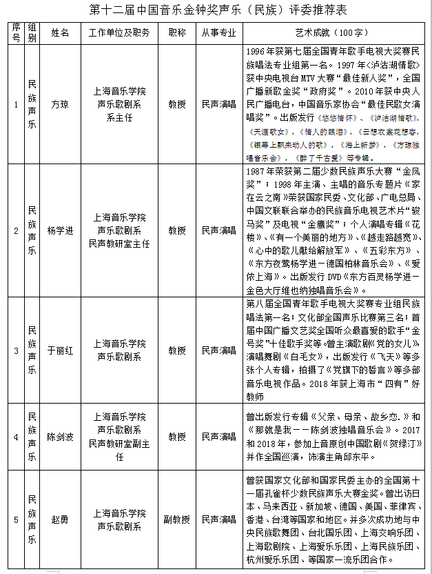 兹有中国音协发来关于第十二届金钟奖评委候选人推荐的商请函,经声乐(含民声、美声)、二胡、小提等相关专业学术委员会提交推荐名单,院学术委员会于2019年3月27日进行了通信评议,评议意见:全票通过各分委会提交的推荐名单,另有吴强委员建议二胡评委名单增加汝艺。根据总体评议结果,我院第十二届金钟奖评委候选人推荐名单如下: