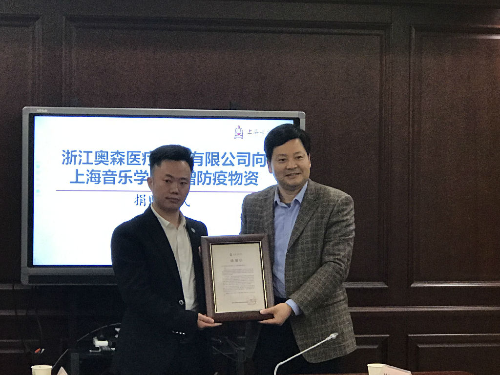 4月10日,浙江奥森医疗科技有限公司董事长陈正洪携手浙江二维生物科技有限公司向上海音乐学院捐赠10万只价值人民币26万元的普通医用口罩防疫物资,助力学校开学复课。