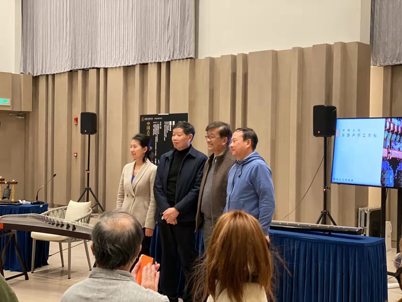 此次讲座,金海鸥先生带来了七弦古琴、五弦琴、十弦琴、古筝各一台以及小编钟一套,向大家展示与分享他研制与制作乐器的心得体会。讲座主要分享的主题为:双音编钟的未解谜、巧妙的双音编钟排列法、双音编钟的组合设计、“中华和钟”之诞生。讲座伊始,金老师提到编钟和双音编钟是两个概念,正是基于此,要复原双音编钟是一件非常困难的事情,同时在制作与复原双音编钟的时候,重要的不仅仅是编钟的外形、图案,更是其背后的声学结构与原理。