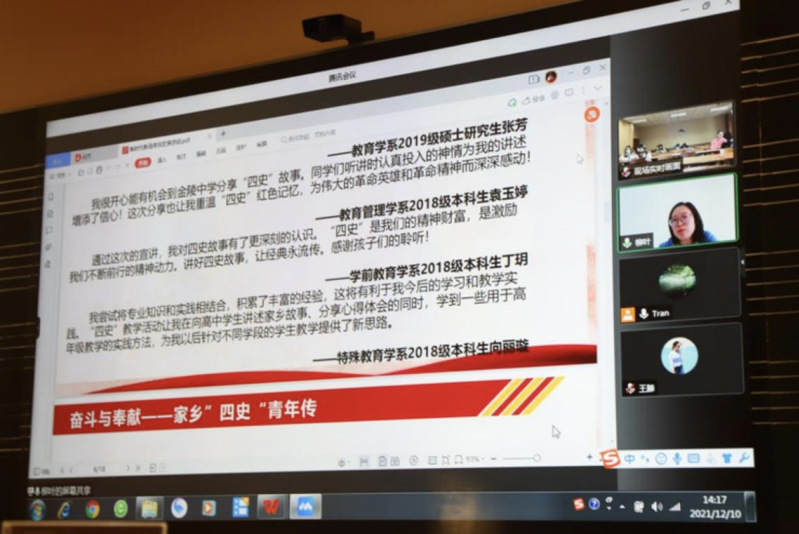 柳叶从社团架构、人员组成、活动形式及社团成果等方面介绍了华东师范大学新时代·新青年党史宣讲团。通过解读社团采用个性化、地域化方式,先调研后实践,并结合当地的红色资源设计独特的线上线下结合的宣讲模式,使四史学习资源进学校、进场馆、进乡村社区,系列活动经验为我校理论学习型社团建设发展提供了重要借鉴。