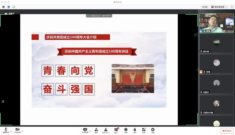 6月10日上午9:30,由共青团上海音乐学院委员会、上海音乐学院学生会、上海音乐学院研究生会主办,特邀中国浦东干部学院教授、博士吴涛在云端开展了主题为“青春向党,奋斗强国”——学习贯彻习近平总书记在庆祝中国共产主义青年团成立一百周年大会上重要讲话的讲座,上海音乐学院校史馆“海尚音苑社”志愿者社团积极参与到本次学习中。