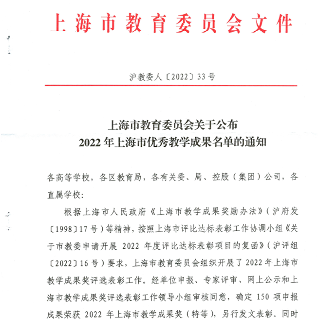 上海市级教学成果奖由上海市人民政府设立,每4年评审一次,是教育领域教学奖励最高奖项。旨在全面总结和展示近年来上海在教育领域所取得的经验和成果,激励取得成果的单位和个人,发挥教学成果在教学实践、改革、研究中的引领作用,进一步提升教育教学质量和人才培养质量。