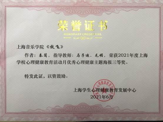 活动月共收到来自各系部参赛海报34件,经校级评选推荐,钢琴系秦简同学的作品《放飞》获得了上海市级2021年度心理健康教育活动月优秀心理健康主题海报三等奖。