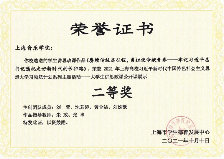 我校现代器乐与打击乐系师生团队在校内遴选中脱颖而出,作为上音唯一代表,入选此次上海赛区比赛,10月,由其主创的思政课作品《赓续传统启征程,勇担使命献青春——牢记习近平总书记嘱托走好新时代的长征路》,荣获2021年上海高校习近平新时代中国特色社会主义思想大学习领航计划系列主题活动——大学生讲思政课公开课展示二等奖。