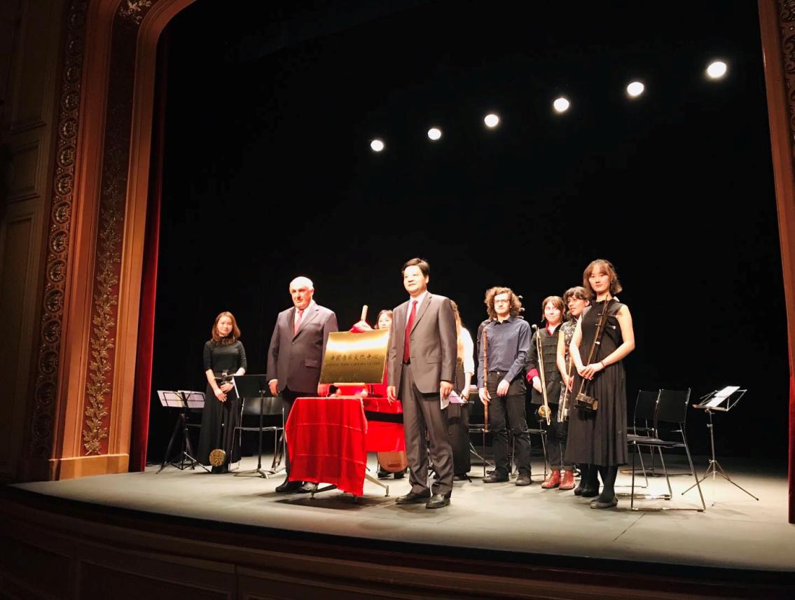 10月12日晚,上海音乐学院与日内瓦高等音乐学院共建“中国音乐文化中心”揭牌仪式及庆典音乐会在让·佛朗索瓦·巴托洛尼街沙龙剧院隆重举行。上海音乐学院副院长侯立玉、日内瓦音乐学院校务委员会特殊项目负责人谢乐教授分别致辞并为“中心”揭牌。日内瓦高等音乐学院师生及当地民众近200人出席活动。