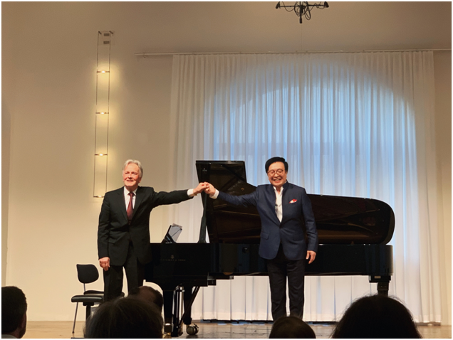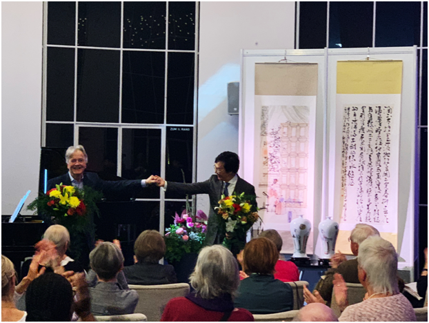 廖院长还表示,1997年以来他曾多次来德国交流和演出,今天很高兴能与世界著名的钢琴大师霍尔教授合作。他将两人的合作比喻成灵魂的碰撞,虽然两人排练的时间不多,但是各自都付出了很多心血,霍尔教授更是亲自将16首中国诗词从英文翻译成德文并装订成册,不断让他的孩子读给他听,用心感受中国诗词的深刻内涵,这才有了现场两人之间珠联璧合的互动。