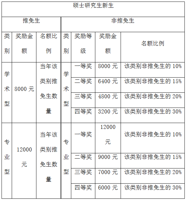 2、硕士研究生。根据2014年下发《教育部办公厅关于进一步完善推荐优秀应届本科毕业生免试攻读研究生招生工作办法的通知》中推免方式的进一步完善,为了鼓励我院本科各系推荐的优秀推免毕业生能继续在我院攻读研究生学位,参评新生奖学金的硕士研究生分为推免生和非推免生两类进行。具体奖励等级、金额、名额比例见下表。