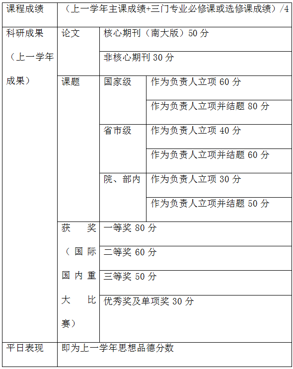 1、每年秋季学期,由研究生部学工办根据研究生部招生办提供的当年研究生入学成绩,按照上述“评定方法”进行排序;