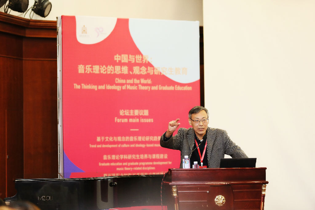姚恒璐教授发言题目是“音乐理论研究的多元性展望——风格美感取向下的创作音响认知”。他主要围绕“基于文化与观念的音乐理论研究趋势与发展”这一命题从以下四个方面进行阐述:一、音高体系化的观念认知——三种音高体系创作分析的实践性;二、音响体系化的观念认知——作曲技法导致风格美感的变迁;三、避免新技法作品的风格雷同——风格认同证实了对音响艺术的审美能力;四、多元文化观念导致多元风格认知与创作途径。姚恒璐教授的论述从音高和音响体系化这些关乎创作技法的基本要素入手,在具有综合意义的观念认知启发下,指出要善于将音响体验归结到理论层面,除了技术分析更要有意识地加强对音乐美感的直接来源,即音乐风格的引证。选材,应当如同创作音乐作品的主题那样重要,也是理论研究最重要的一步。姚恒璐教授认为在以作曲技术理论为主题的理论分析研究当中,要关注作品产生的文化背景,并以一些中国文化中的特有理性艺术现象为例,说明艺术技法与观念文化之间的关联。他倡导应当避免以单纯技术观点去诠释一部成功的艺术作品,音乐作品的理论研究是以“观念-意识-技法-风格-审美”作为有机关联的主线,也是创作与分析共同遵守的艺术规律。