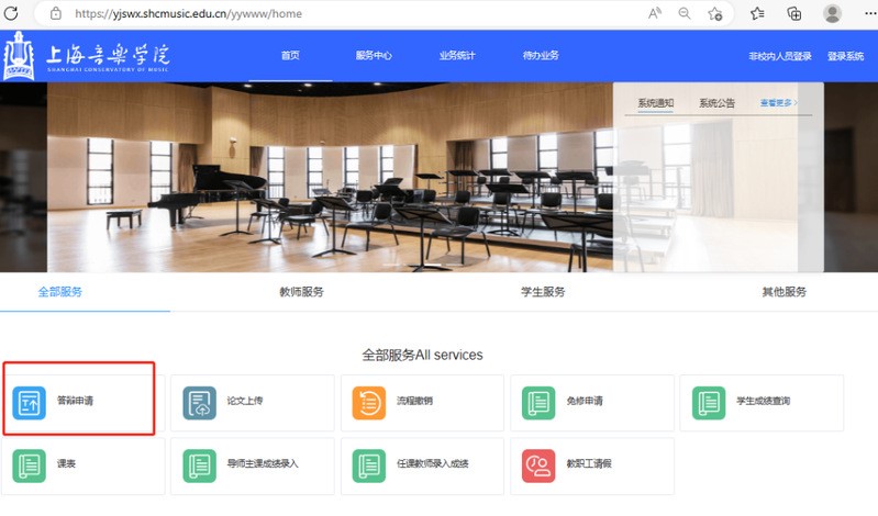 1.进入上海音乐学院研究生部网站—选择“上音研究生教学服务系统”