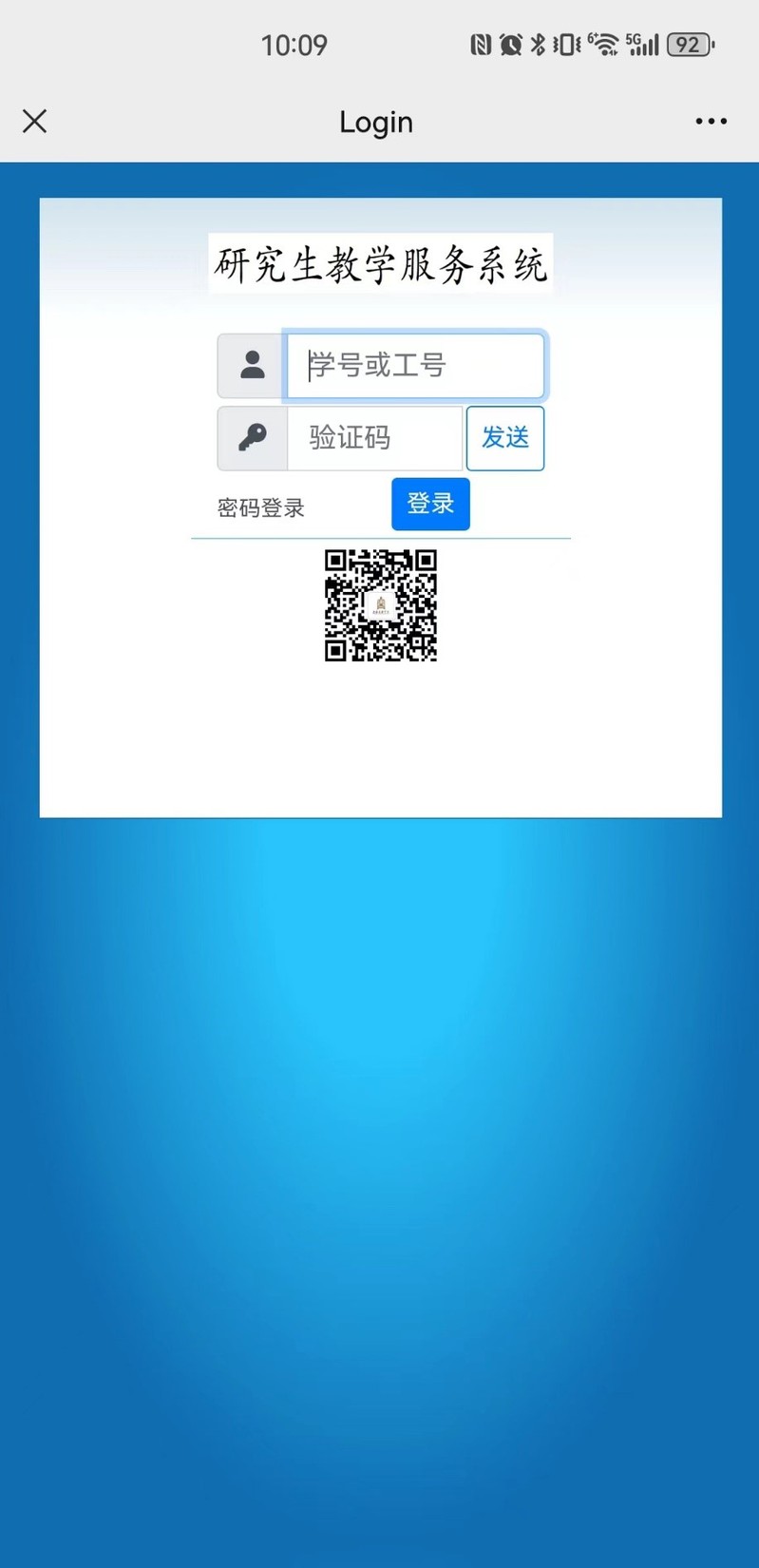 1. 微信公众号点击“上音研究生教学服务系统”,使用学号和验证码进行登录。如无法收到验证码,请邮件联系培养办。