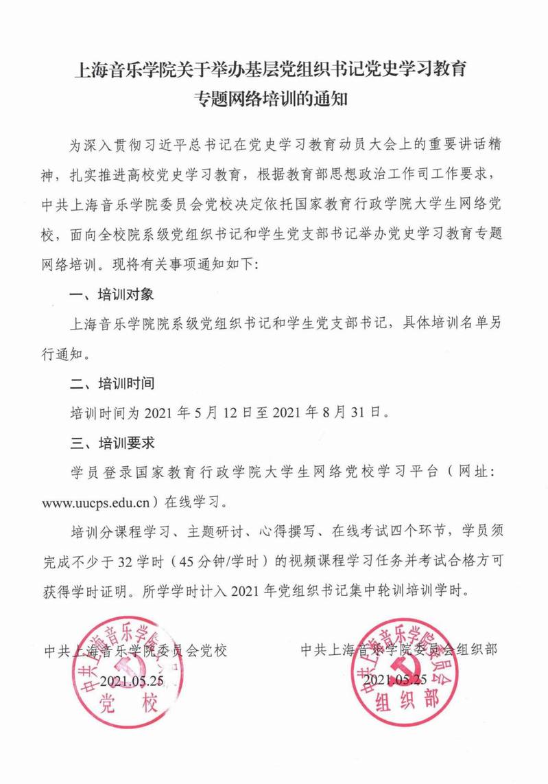 上海音乐学院关于举办基层党组织书记党史学习教育专题网络培训的通知