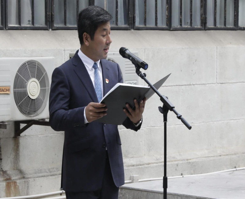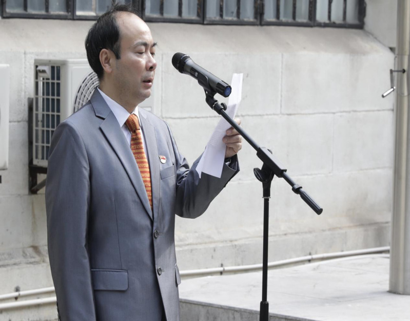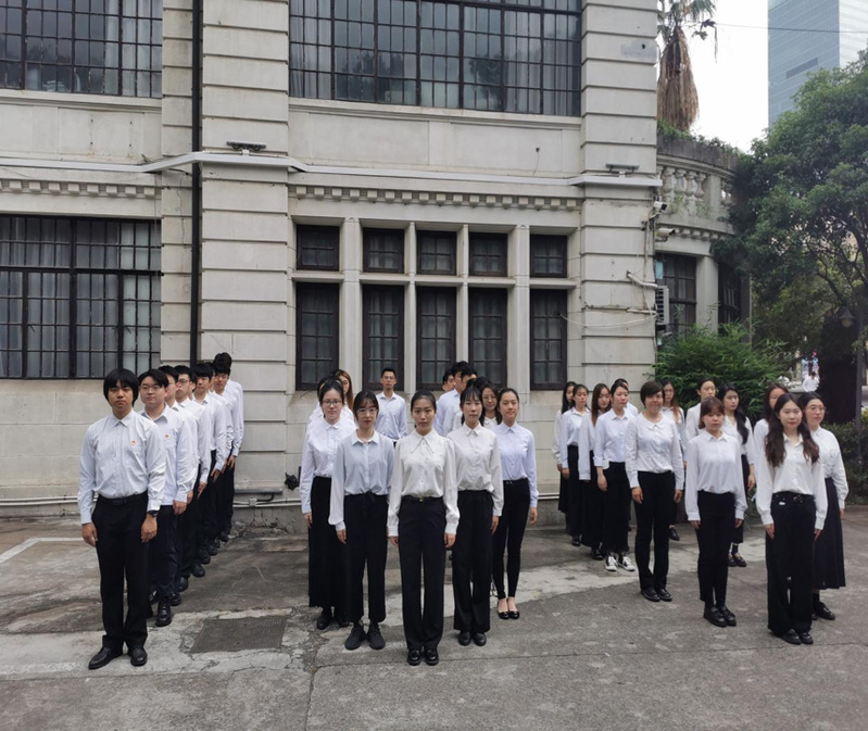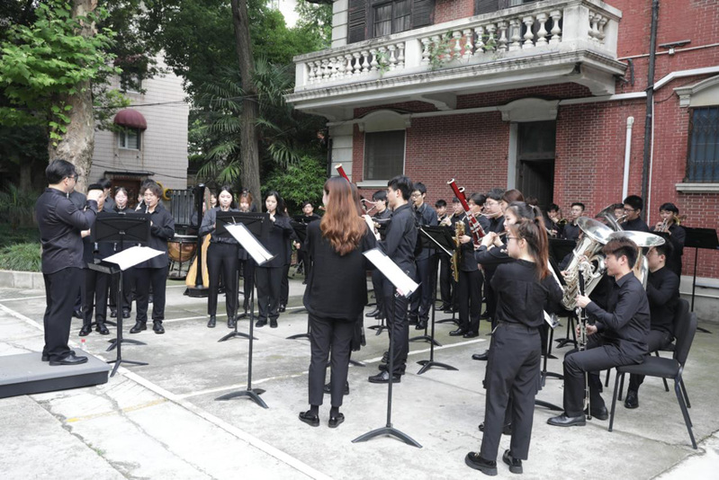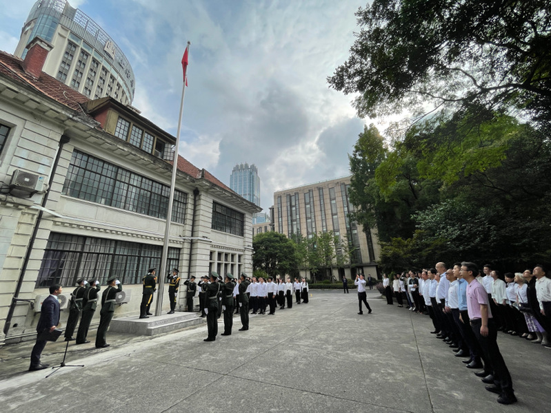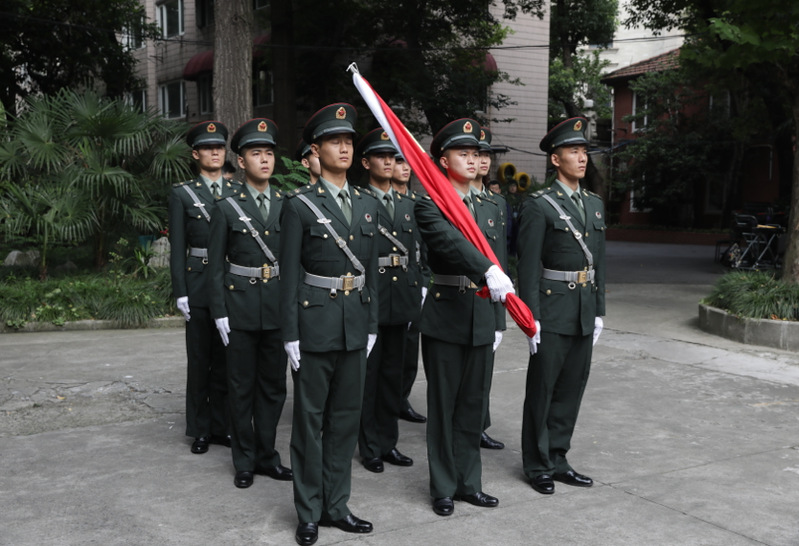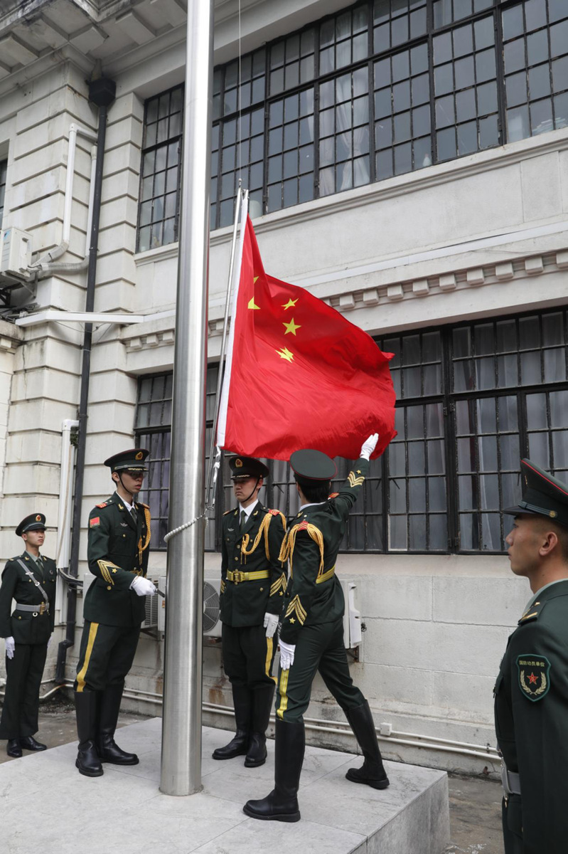 管弦系承办升旗仪式,党总支书记盛利主持。上海音乐学院党委书记徐旭带领院领导班子成员一行七人出席仪式。院各职能部门领导、各系部师生、以及管弦系部分师生代表、离退休教师等出席活动。上海警备区警备纠察队官兵特邀担任国旗护卫队。管弦系三名学生担任升旗手。