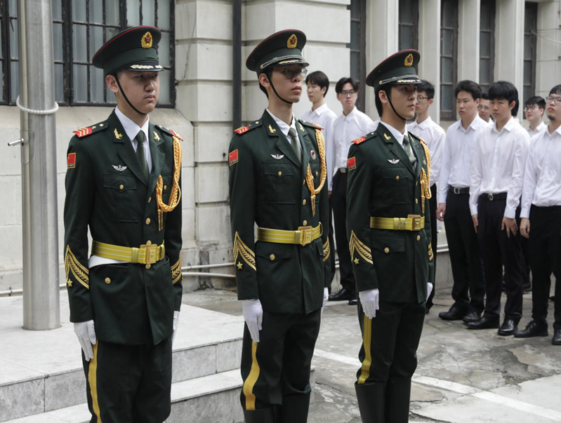 伴随着铿锵有力的步伐,警备区官兵护卫队将国旗交送给升旗手,三名经过考核训练的同学整齐熟练的完成一系列动作。指挥周珂带领管乐团奏响《中华人民共和国国歌》。鲜红的五星红旗在庄严的国歌中冉冉升起!100年来,是中国共产党带领中国人民经过艰苦卓绝的武装斗争,建立了社会主义新中国,从根本上改变了中华民族的命运,写下了彪炳千秋的光辉诗篇。师生们全体肃立,高唱国歌,以崇高的敬意为我们伟大的党和祖国献上最美的祝福,以饱满的热情为党献礼!