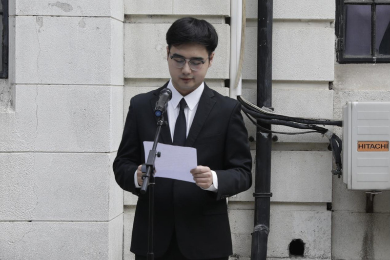 管弦系金钟奖获得者林瑞沣代表青年发言:“我们要怀着一颗感恩的心,用音乐艺术在世界的舞台上讲好中国故事、传播中国声音;我们要成为社会主义先进文化发展的中坚力量,体现当代上音青年的使命与担当!”