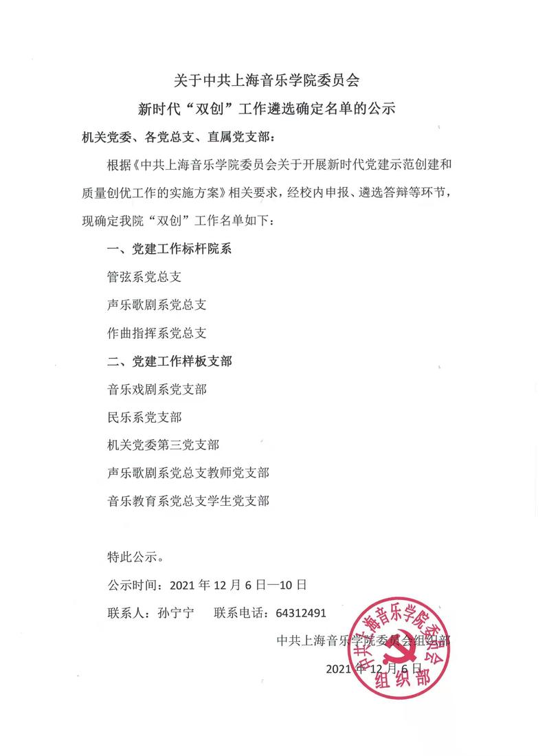 关于中共上海音乐学院委员会新时代“双创”工作遴选确定名单的公示
